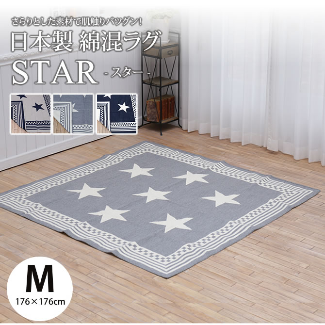国産綿混ラグ スター 176×176cm (綿混ラグ 正方形ラグ 洗濯 おしゃれ 絨毯 カーペット インテリア じゅうたん ラグマット バンダナラグ ヴィンテージ 丸洗い 敷物 デザインラグ ビンテージ)