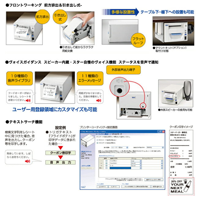 FVP10シリーズの特長 フロントワーキング引き出し式前方排出により、ラクラク用紙交換ヴォイス機能スピーカー内蔵・ステータスを音声でお知らせ用紙幅が中央寄せでリニアに可変用紙幅微調整ダイヤルにより58〜80mmリニアに可変縮小印字機能アプリケーションを変更せずに、印字結果を縦・横に縮小テキストサーチ+音声機能を実現登録した文字列を検索し、音声出力&クーポン等を印字フラットルーフ天面がフラットなため、プリンター上スペースにも上載せ可能Product Information / 商品情報商品コードSET00000002品番プリンター:FVP10U-24J1 GRY JP ACアダプター:PS60A-24C アダプタL JP インターフェースカード:IFBD-BE07JANコード プリンター:4951319238416 ACアダプター:4951319198192 インターフェースカード:4951319195467 品名Star Micronics Stationary Thermal Printer FVP10 Series FVP10U-24J1 GRY JP Set (including AC Adapter and Interface Card) スター精密 据え置き型感熱式プリンター FVP10シリーズ FVP10U-24J1 GRY JP セット(ACアダプター、インターフェースカード付き) カラー Gray グレーレイアウト平置き 印字方式ダイレクトラインサーマル印字 文字仕様印字構成英数字12×24ドット IBMグラフィックス12×32ドット 半角漢字12×24ドット 全角漢字24×24ドット印字桁数最大48桁(12×24フォント) 最大24桁(漢字・24×24フォント)文字サイズ12×24フォント1.5mm×3.0mm(W×H) 12×32フォント1.5mm×4.0mm(W×H) 半角漢字1.5mm×3.0mm(W×H) 全角漢字3.0mm×3.0mm(W×H)文字種英数字、拡張グラフィックス、国際文字、JIS第一、第二水準漢字 バーコード規格UPC-A/E、JAN/EAN8、JAN/EAN13、ITF、CODE39、CODE93 CODE128、CODABAR(NW-7)、PDF417、QRコード 解像度8ドット/mm(203dpi) エミュレーション スターラインモード、ESC/POSモードインターフェイスUSB(2.0)、Ethernet印字速度最大250mm/秒用紙形態感熱ロール紙、感熱ラベルロール紙(BM)サイズ79.5±0.5mm(デフォルト)〜57.5mm±0.5mm(リニアに可変)巻径最大83mm厚さ65〜150μm オートカッタータイプギロチン式カット方式パーシャルカット(中央一点残し)/フルカット寿命200万回カット(推奨紙) ※カット方式、用紙厚により寿命値は異なります電源電圧DC24V±10%消費電流 (ASCII連続印字時)約1.6A(DC24V)外部入出力回路外部機器(キャッシュドロアー等)駆動回路を2回路搭載(24V、最大1A)、入力1回路信頼性MCBF6,000万行スピーカー内蔵スピーカー有(o16-h3:スター精密株式会社製)外部端子 有(o3.5 モノラルミニジャック) 外形寸法 144×228×114mm(W×D×H) 重量 約2.8kg(ロール紙、オプション品、付属品含まず) EMI規格VCCI:ClassA、FCC:ClassA、EN55022:ClassB、UL、C-UL、TUV ACアダプター付属 保証期間1年間注意 ■ ご注文の際は、以下内容を予めご了承ください。